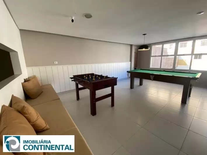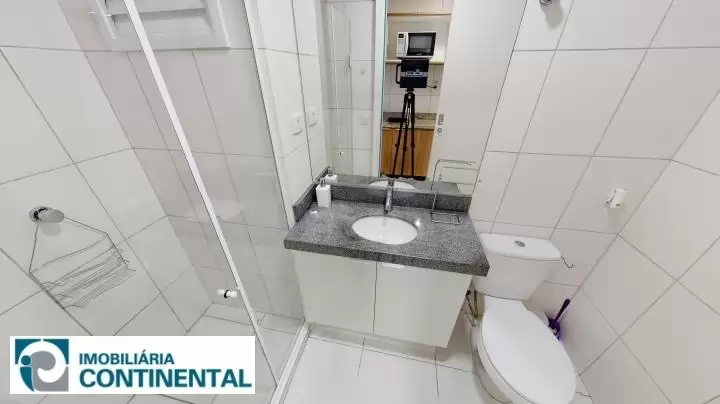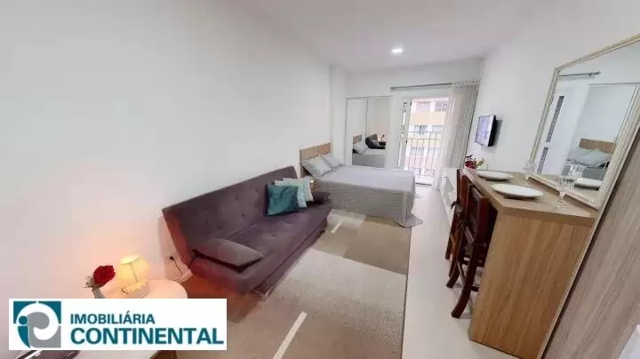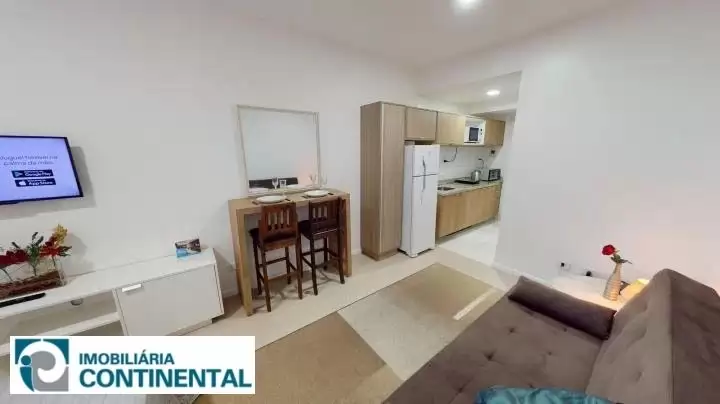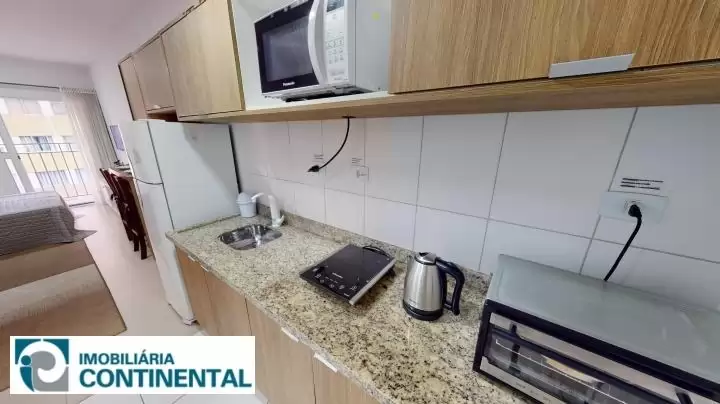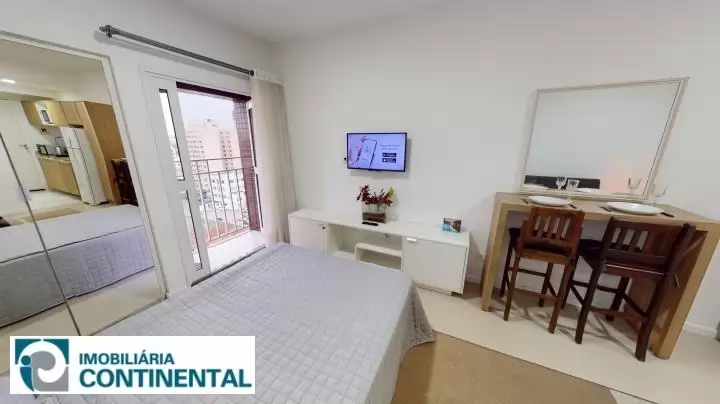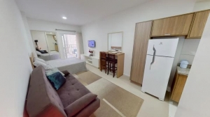 O apartamento studio totalmente mobiliado está no 5° andar, face sul, contendo 27m² privativos, 41m² de área construída e contém sacada privativa. Conta com cozinha completa, armários, prateleiras, micro-ondas, cooktop elétrico, forno elétrico e geladeira duplex. O imóvel ainda possui confortável sofá-cama e bancada para refeições com dois lugares, smart TV 32", rack, cama box casal e guarda roupas embutido. O banheiro é completo com armário, espelho e box. O imóvel não conta com vaga de garagem.
